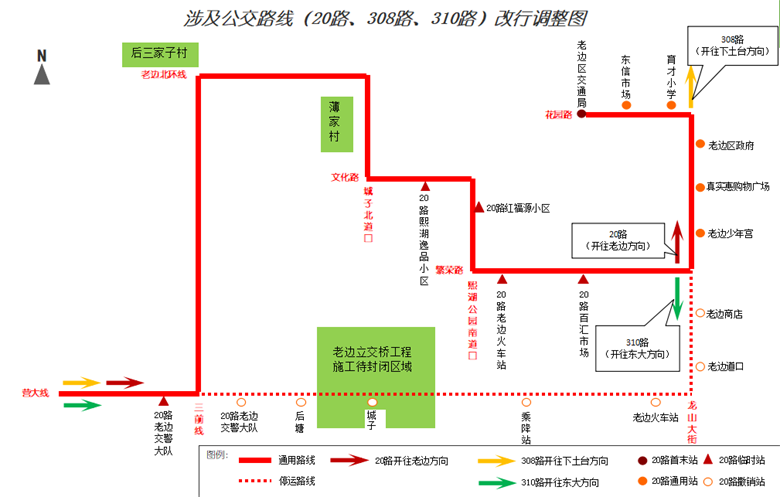 途徑封閉路段參照20路改行路線執(zhí)行,自龍山大街與繁榮路交匯處向南至東大歸到原線路運(yùn)營(yíng)。